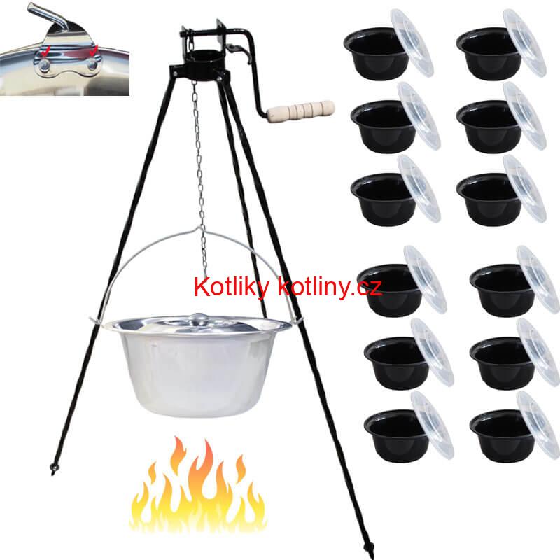 - Nerezový kotlík 15 L (0,8 mm) s nýty + stojan s kladkou VAR + misky 12 ks