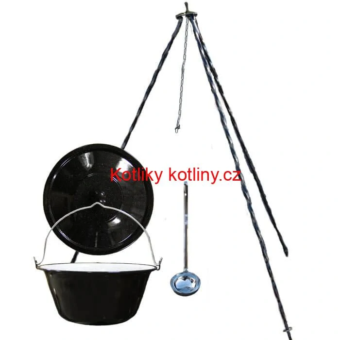 Kotlíková souprava na outdorové vaření guláše a rybích polévek v přírodě, v zahradě nebo v otevřené kuchyně, především pro chalupáře, chataře, do kempu a na táboření.